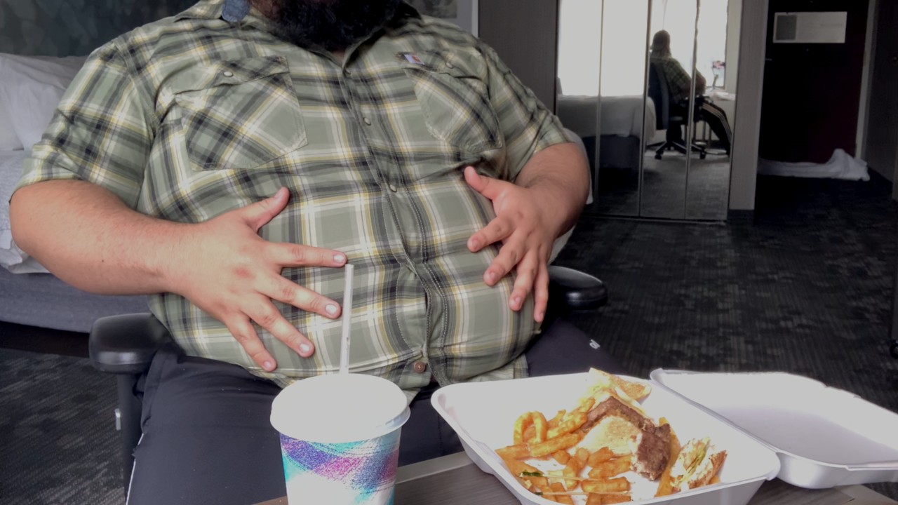 Just need a quick snack, and what better way than to have a sandwich with fries, and a large soda? Watch me sit down and stuff myself full of my snack as my gut expands and expands, and the buttons start to strain. I need to belch to make some room, but I still have to pop open the buttons! I groan and moan as I continue eating, and rub my growing huge gut, letting it free to hang, while I belch even more and more–a sign of a good stuffing. I get up, and show off my stuffed belly, with more even belching. Even after all that, though, I’m still kinda hungry… wanna see me eat another one? Stuffing, button popping, chugging, loads of belching, and loads of belly play.