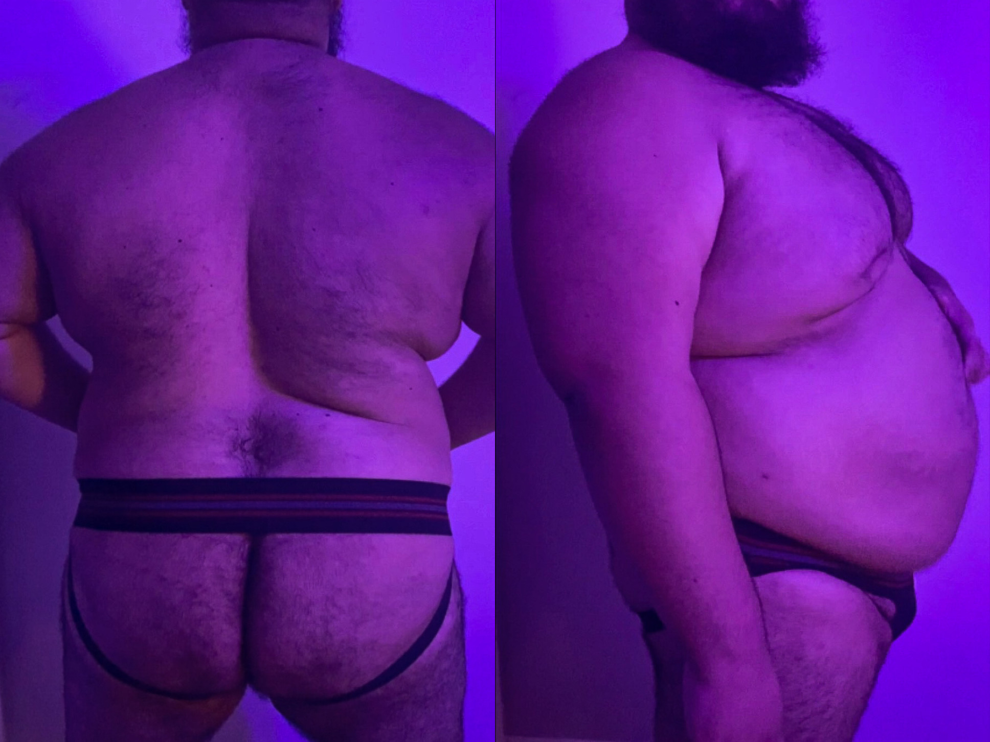 I put on my old, too-tight, jockstrap to show off how much I’ve grown. Guess this is an ex-jock body. Massive belches throughout, lots of belly and chest play, pec bouncing, and ass shots.  (image is 2 screenshots put together)